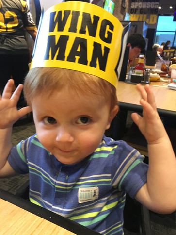 Eventually (i.e. way later than planned) we headed out for St. Louis, not surprisingly the ones who slept in were hungry. So we found a Buffalo Wild Wings for a quick lunch...I mean lunch. It turns out that this particular restaurant had just opened on Monday and was still working out the kinks, things like putting salad dressing on a salad:) However, I thoroughly enjoyed my lemon pepper wings and the kids loved the hats!